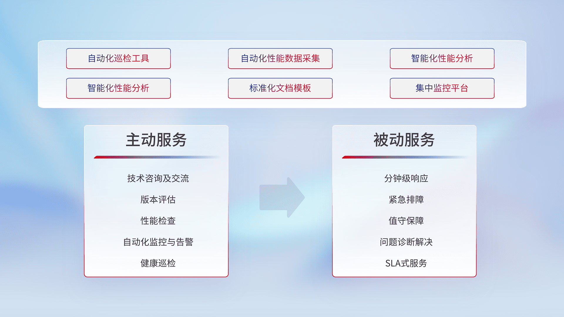 智能化工具和标准化文档,,,保障服务质量,,,提供主动服务(包含技术咨询、、、、版本评估、、、性能检查、、自动化监控与告警、、、健康巡检)和被动服务包含(分钟级响应、、、紧急排障、、、、值守保障、、问题诊断解决、、SLA服务)。。